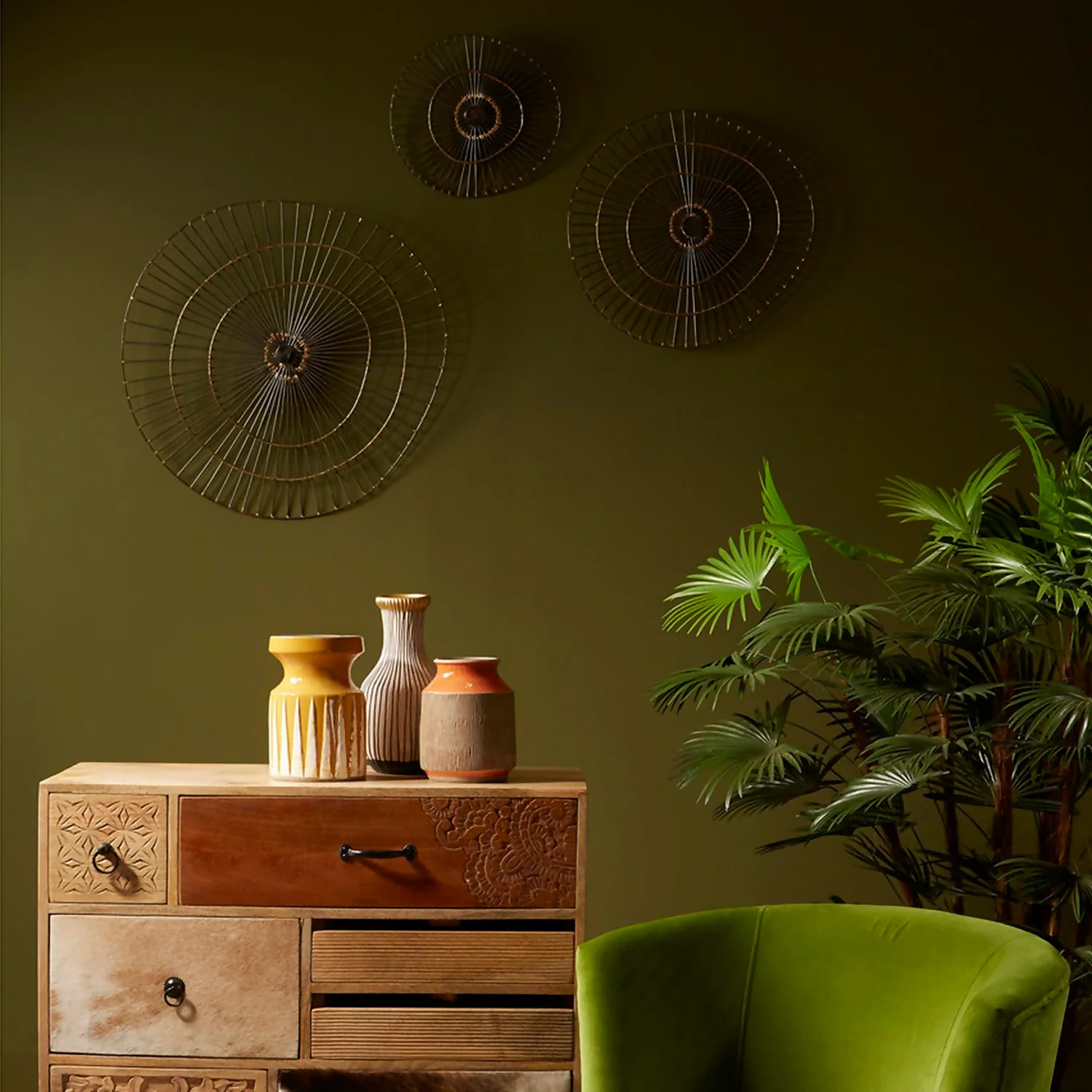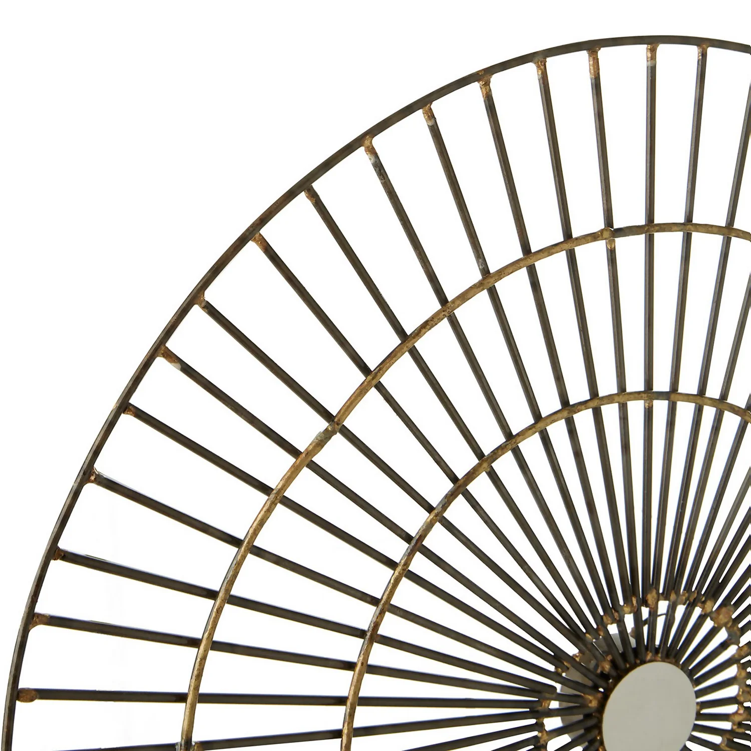 Sleek iron wires emerge out of a circular centre to form the sunburst design frame of this small piece of wall art. Bright gold finish detailing effortlessly blends with the more muted hues of the wire frame and its irregular, curvy rim. Use this abstract piece of art to make a statement in a contemporary setting.